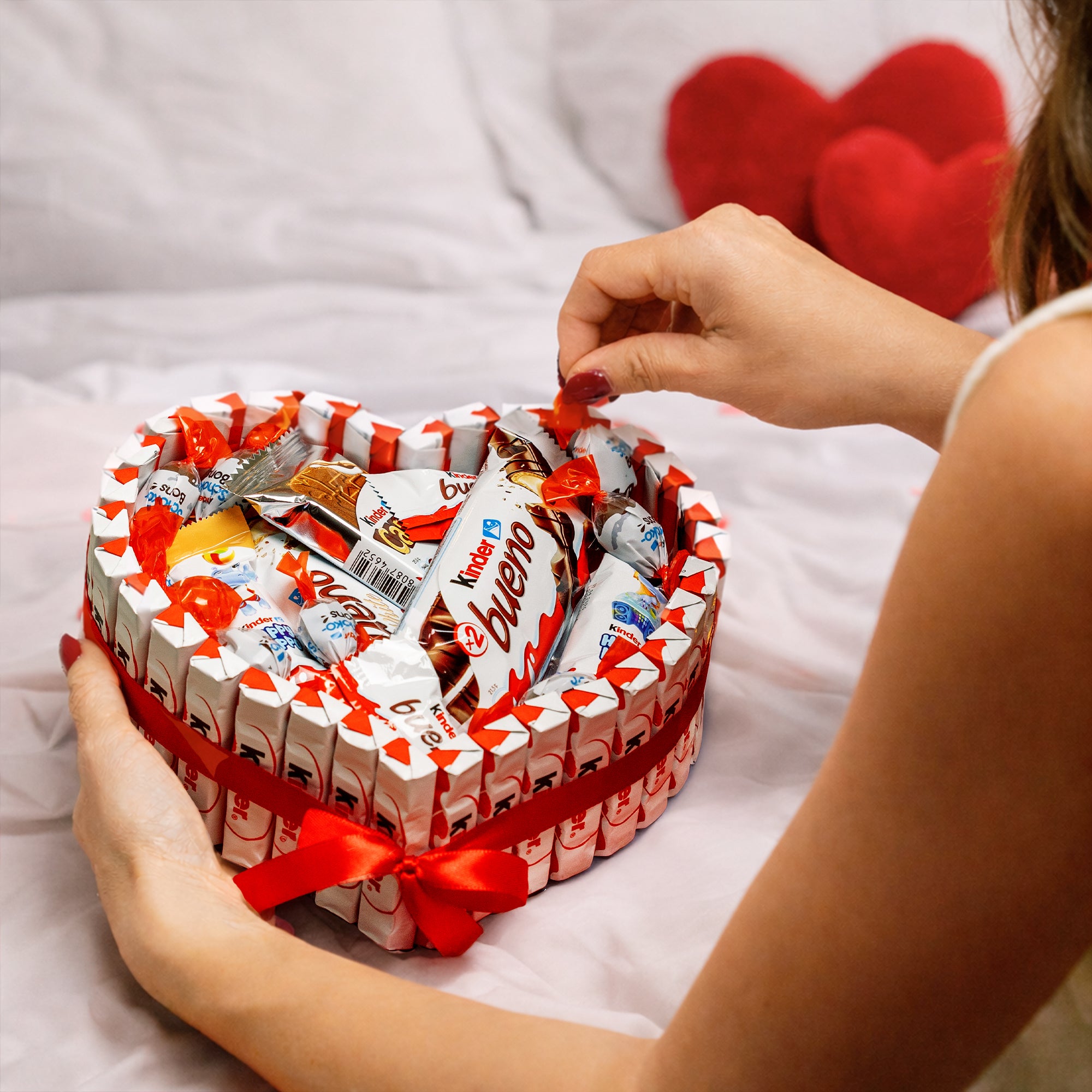 Sorprende con esta deliciosa tarta en forma de corazón, repleta de un exquisito surtido de chocolatinas Kinder. Perfecta para regalar por San Valentín, día de enamorados o cualquier ocasión especial.